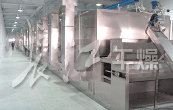 米饭专用带式干燥机是我公司针对蒸煮后的米饭、浸泡后的糙米、大米等米制品研制出的专用干燥器。潮湿物料经由特制的铺料机,将其均匀的摊铺在匀速运行的不锈钢网带上(网带采用平衡折边网,SUS304不锈钢材质制作,符合食品级要求,使用寿命长),承重网带在变频调速电机的拖动下向前匀速移动,进入干燥室。干燥室由若干单元组成,每个单元热风独立循环、温度自由调节,湿空气由专门排湿风机排出(排湿量由调节控制),空气在循环风机导向下经换热器加热后,由上往下穿过分风板,与物料完成热量与质量传递的进程,带走物料中的水分。干燥室内安装若干翻动装置,使所有物料均匀与热风接触,提高物料干燥效果的均匀性。干燥后的成品连续落入收料器中。